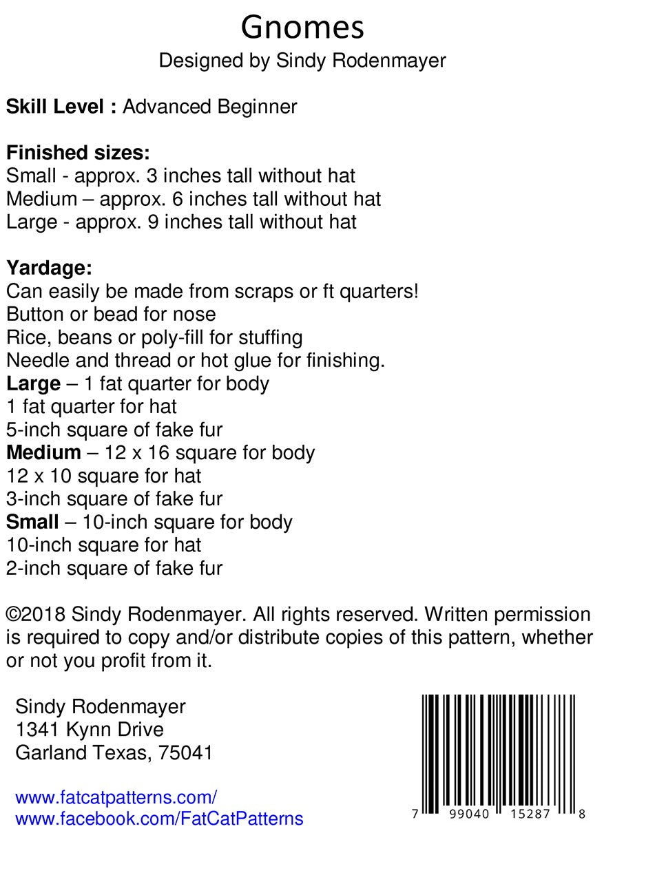 Gnomes are not just for the garden anymore. Decorate your home with these fun happy little fellows. Can easily be made from scraps or fat quarters. Finished sizes, Small 3in tall without hat, Medium 6in tall without hat, Large 9in tall without hat.