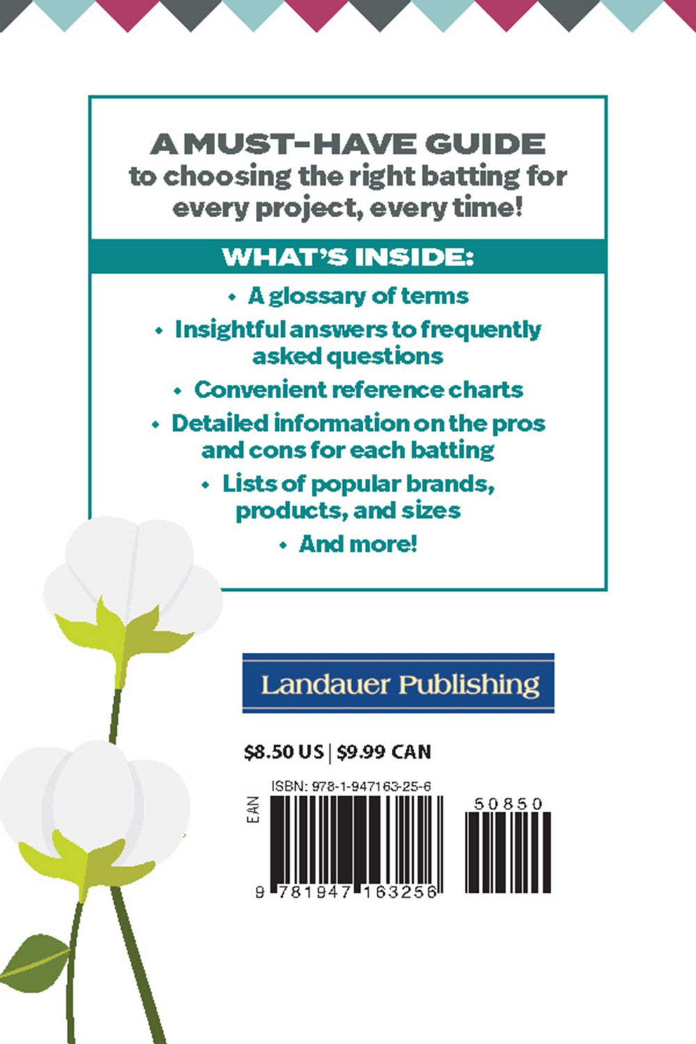 Choose appropriate batting, know how to use it correctly, and avoid common mistakes with this resourceful pocket-sized guide, Know Your Battings. Containing over 50 pages of terminology definitions and charts listing retailer batting names, finishes, roll widths, stitch spaces, recommended quilting comments, and so much more, you won’t want to start another project without this guide. Take it with you to the store so you get the right batting every time, resulting in a quilt you’ll love!