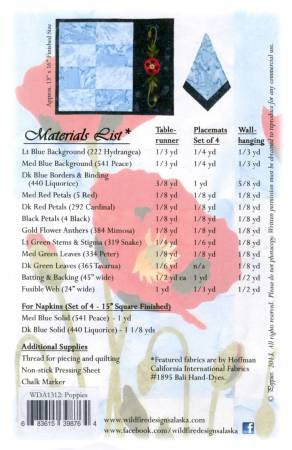 This pattern features Hoffman California Fabrics. The pattern includes instructions for the Poppies tablerunner, wallhanging, placemats and napkins.