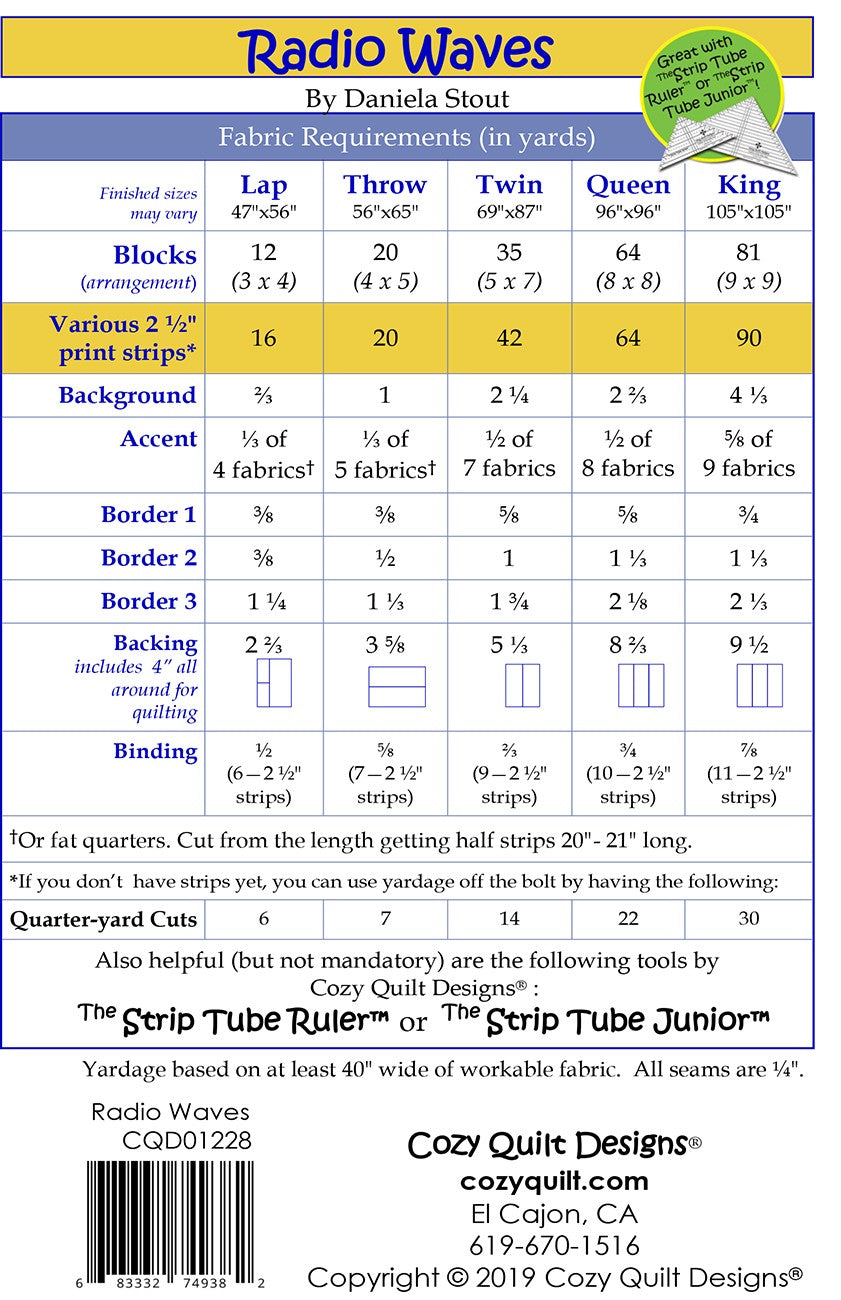 This quilt is made even easier with our Strip Tube Ruler or Strip Tube Junior! The pattern includes full color instructions for these sizes: lap, throw, twin, queen, and king.