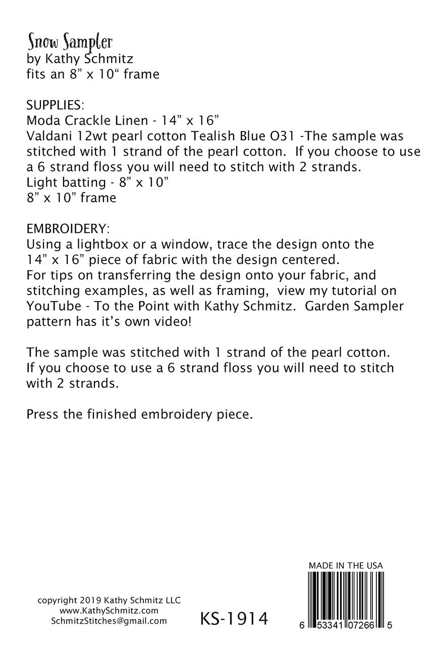 Let it snow, let it snow, let it snow! Do you love a blustery winter day? Why not stitch up this snow sampler and you'll have a snow day every day! Fits in a standard 8" x 10" frame.