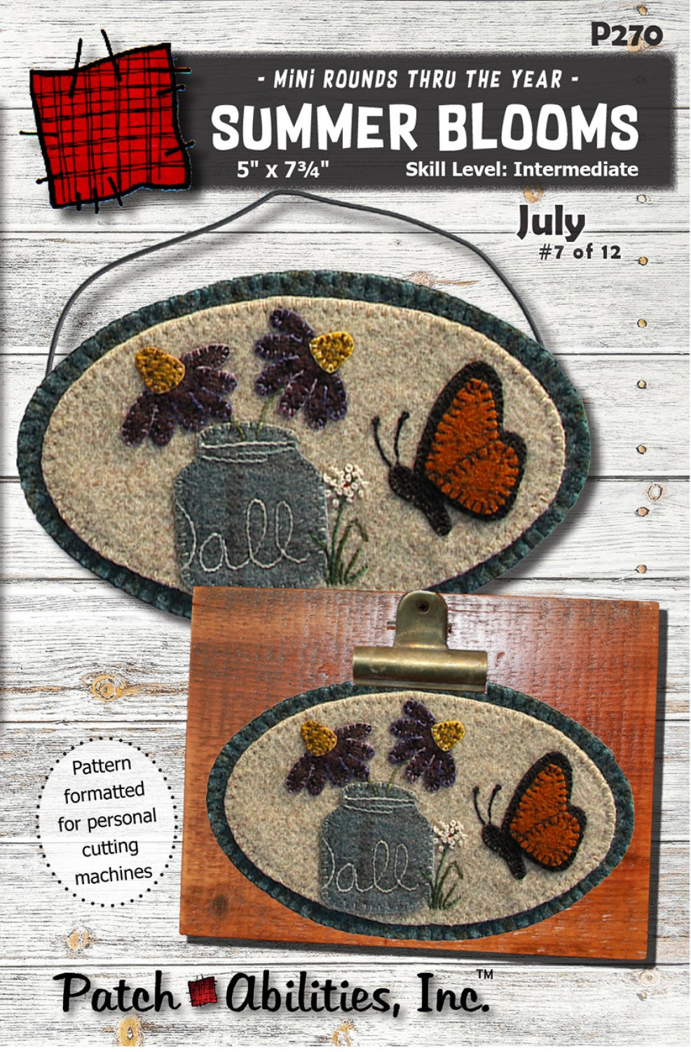 Fusible cotton or wool applique, finishes at 5.5 x 8 in. July project in Mini Rounds Thru The Year BOM series, though also available as a stand alone pattern. The unique oval shape lends versatility -you can display on a wall or shelf with the 7x9 inch reclaimed wood clipboard, or simply lay upon a table or furniture where you want to add a dab of warmth. A Monarch butterfly investigates the flowers of mid summer like Queen Anne's Lace and Purple Coneflowers in a Ball jar. Well written pattern beginners love as it includes enlarged layout and stitch guide so you can see the hand embroidery close up, and hand stitch diagrams. I assume nothing and explain everything, making this perfect for any skill level.