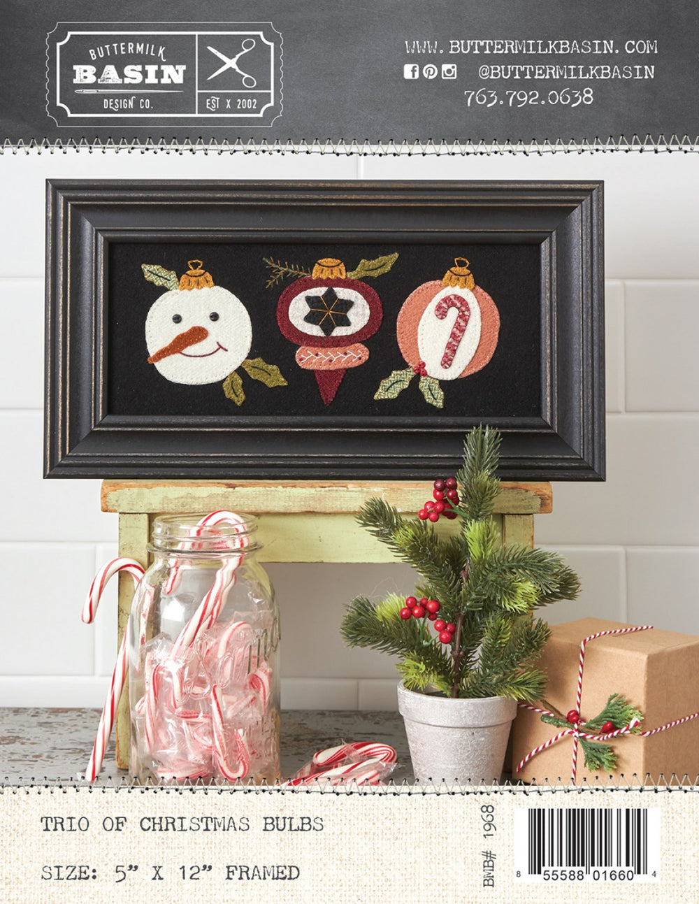 What a cheerful trio of Christmas bulbs! Frame this wool applique piece, or make into a pillow or mat! 5 X 12 Inches Framed