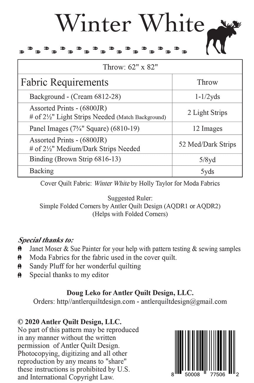 FULL COLOR instructions. Great for scraps! Panel Image and Feature Fabric Friendly! Sizes: Throw: 62" x 82" Fabrics used in the pattern cover quilt Winter White by Holly Taylor for Moda Fabrics Recommend notion: Simple Folded Corners or Mini Simple Folded Corners ruler.