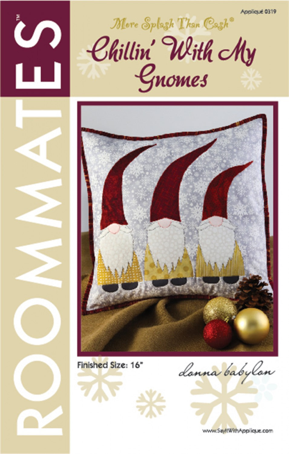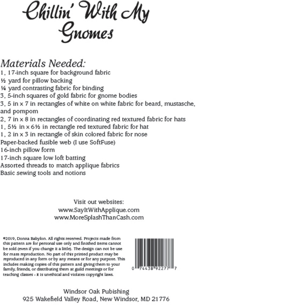 Gnome Alone for your home! Cuddly and cozy flannels and cottons can be combined to create this gnome pillow. Display the pillow during the holidays but keep it around all through the winter. Designed for raw edge applique. Full size pattern pieces and complete instructions included. Finished size: 16 in.